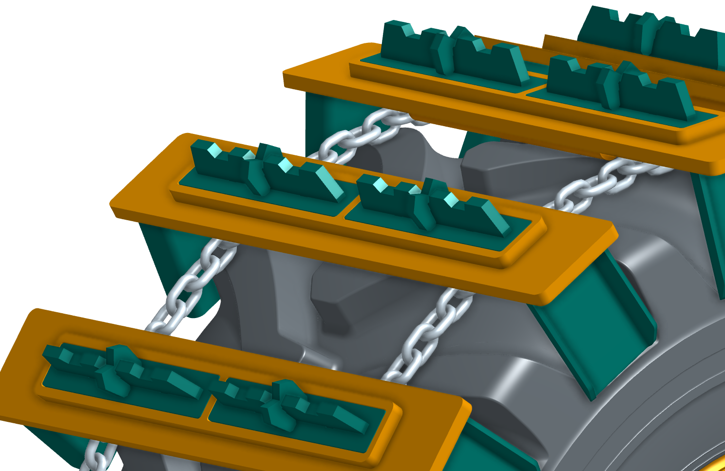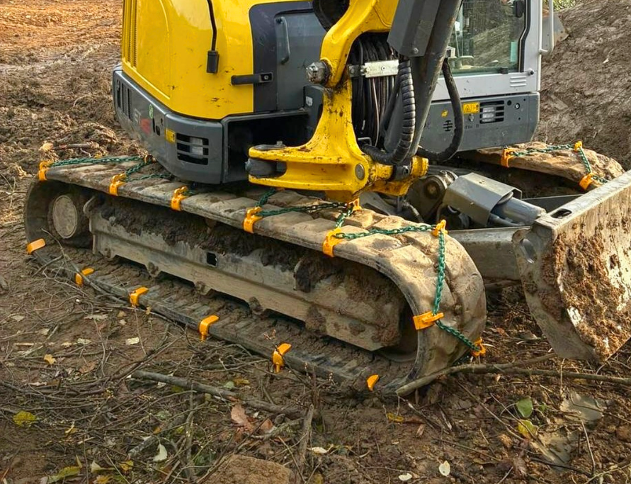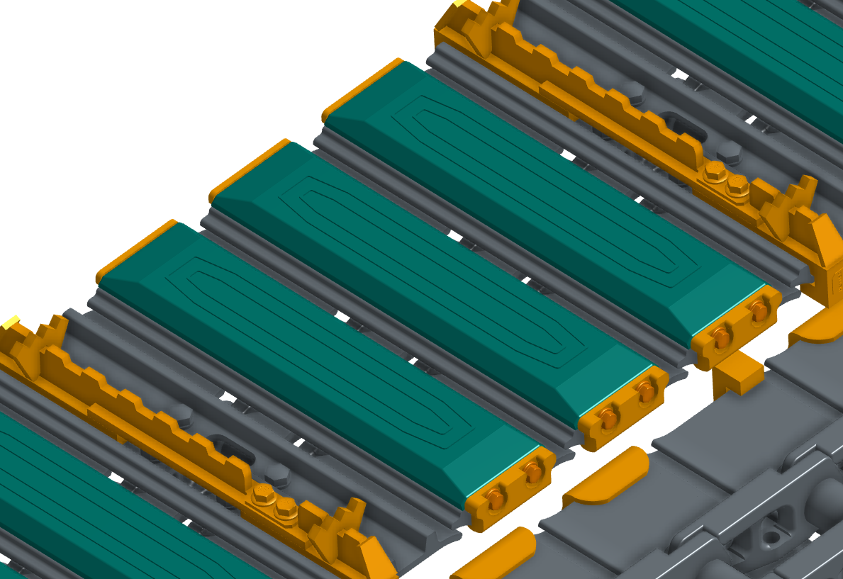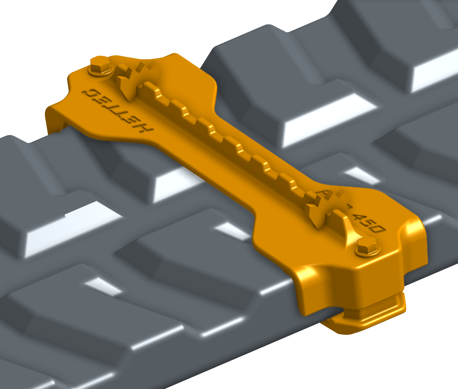 Die aufgesetzten Traktionsbügel werden über das HETTEC® Spannsystem sicher auf der Gummikette fixiert.